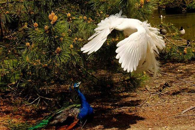 Hai chú chim công trắng và chim ngũ sắc nhảy múa bên nhau trong vũ điệu tuyệt đẹp của loài công